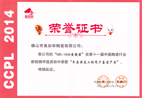 3月28日,“第十一屆中國(guó)陶瓷行業(yè)新銳頒獎(jiǎng)典禮”、“中國(guó)制造?佛山論壇”在佛山新媒體產(chǎn)業(yè)園隆重舉行,美加華衛(wèi)浴旗下MB-1858連體坐便器喜獲新銳榜“年度最受工程用戶(hù)喜愛(ài)產(chǎn)品”獎(jiǎng)。